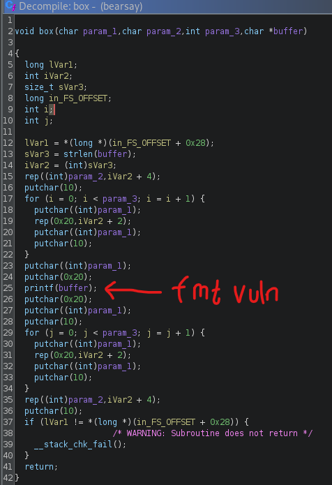 following the routine calls, we can see below the format string vulnerability where printf() is called without any hard coded format as its first argument