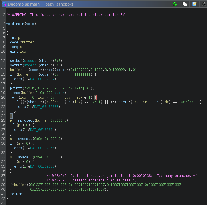 the program has only one function main(). first it mmap a new page at a hard coded address, it will then prompt an input to us asking for input at said mmap page as we can see below: