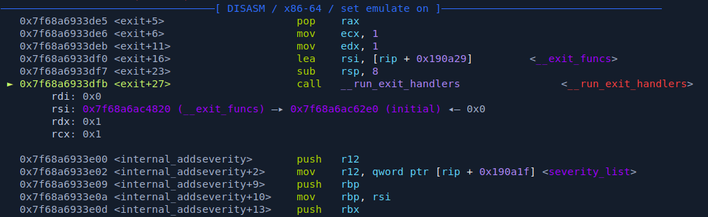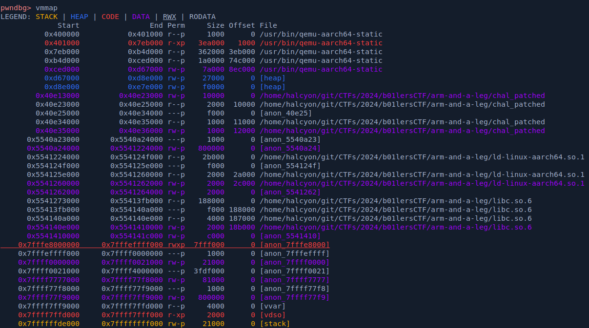 notice we have no libc or other memory region as we would normally see. this is because everything is simulated and no library is actually mounted to the binary which in itself is not running as a process.