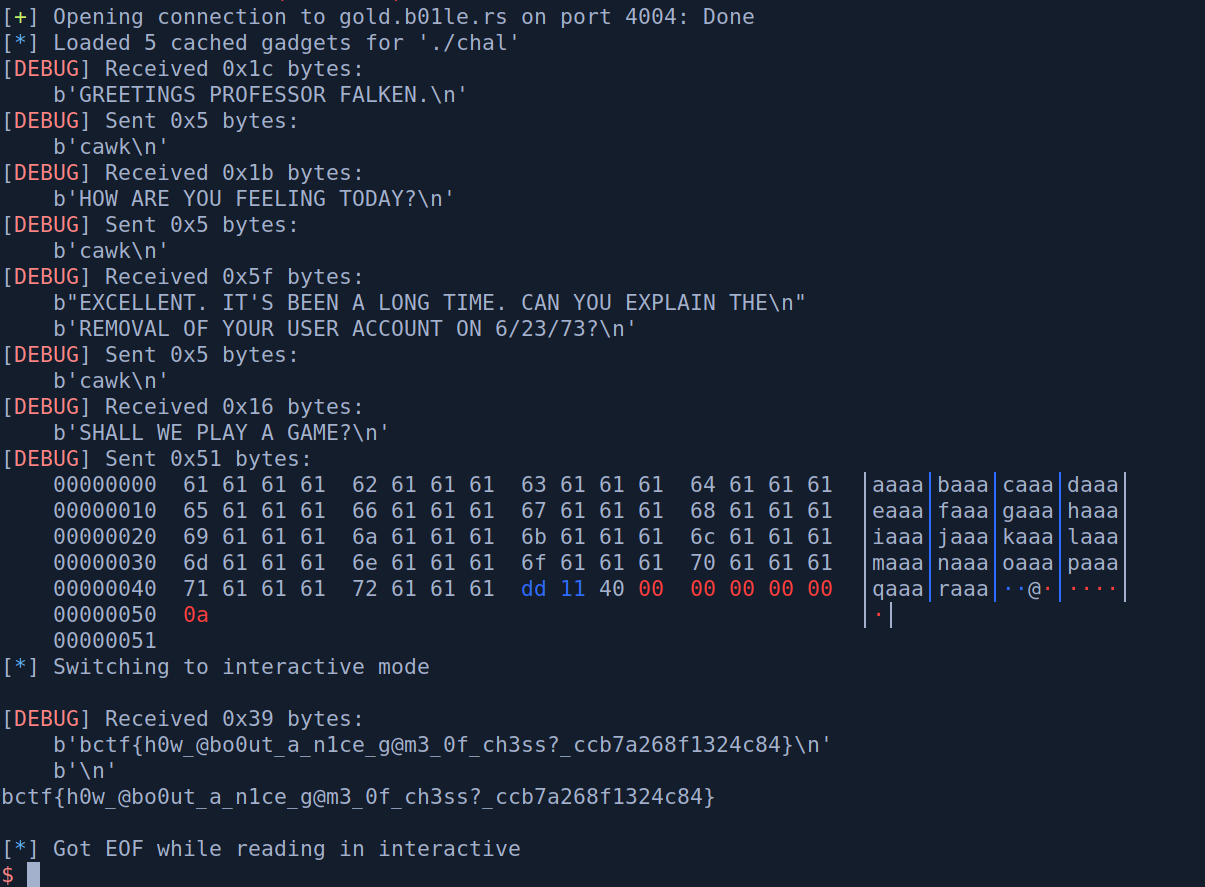 io.sendlineafter(b'FALKEN', b'cawk')