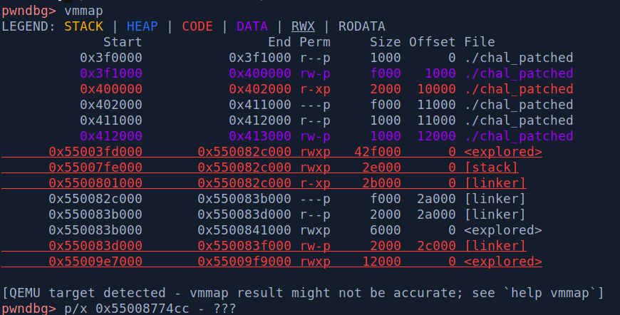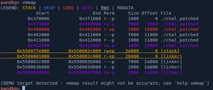this is because qemu itself is a simulation, not a virtualization technology. comparing to the vmmap of python exploit.py GDB we can see a difference