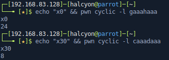 looking back at feedback(), we know we have a buffer of 104 before canary, since the stack frame will be different, I will use the De Brujin sequence to determine the offset to control execution.