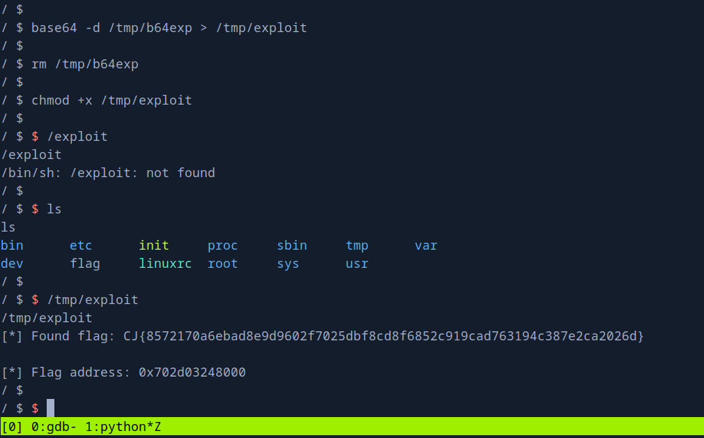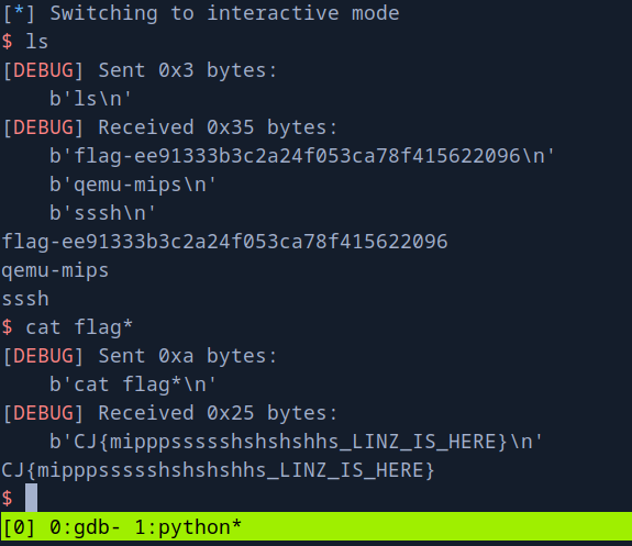 and so next is just to call syscall and shell should be spawned, here is the exploit being ran againts the remote server: