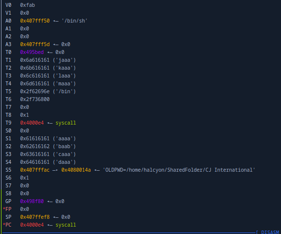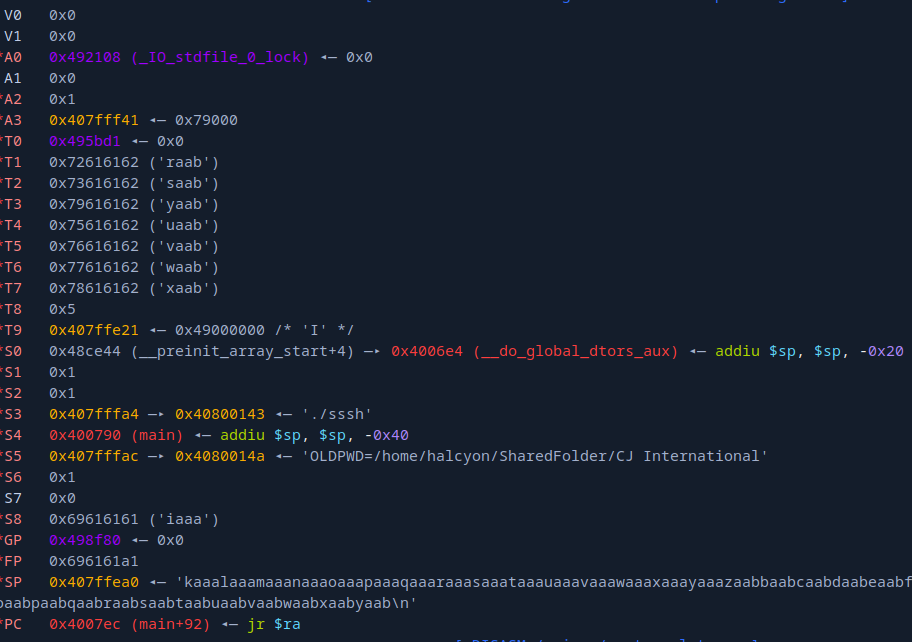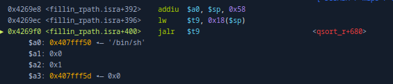 0x00441ca0 : lw $t9, 0x20($sp) ; move $a2, $s0 ; addiu $s2, $s2, 1 ; jalr $t9 ; move $a1, $fpsince $s0 is once again in our control from the 2nd gadget chain, we can control what goes to $a2. next as I run the binary up to this chain, I notice that the $a1 is also got nullified by the result of said delay slot of move $a1, $fp, conviniently $fp was 0.