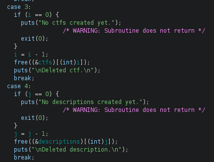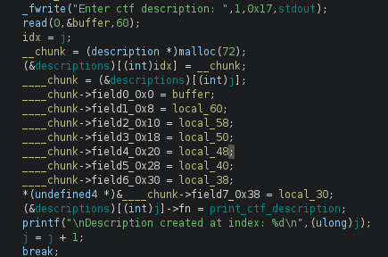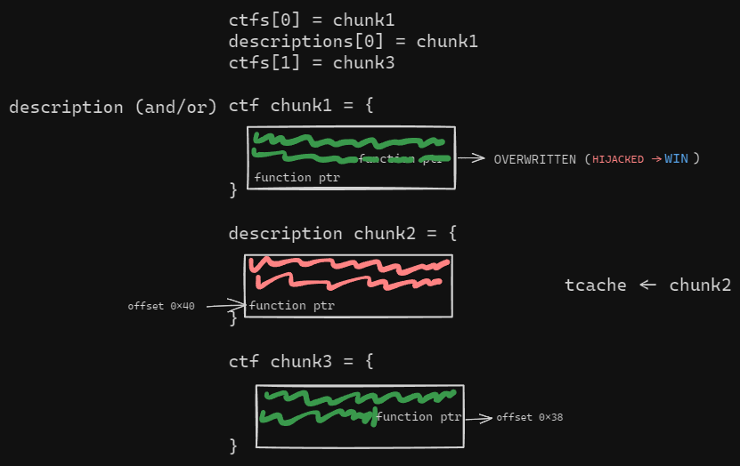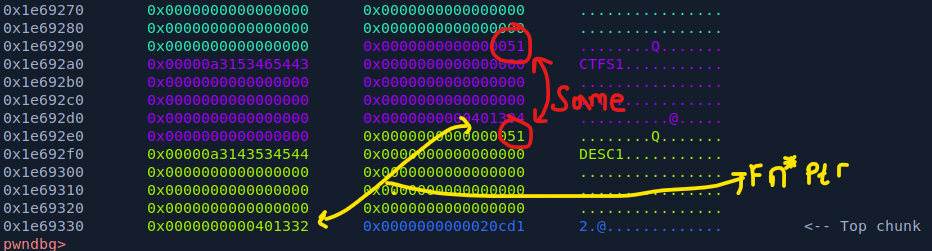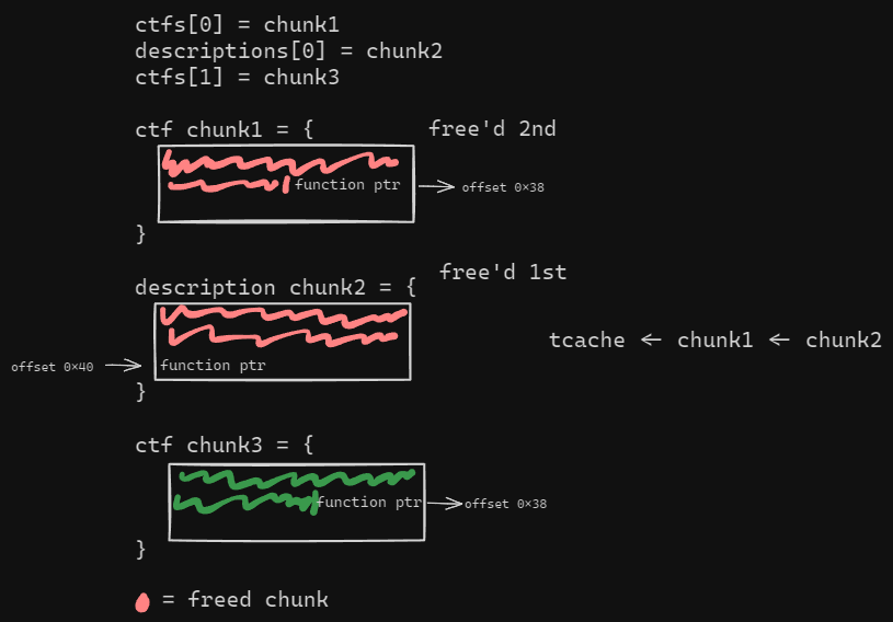 notice how description[0] and ctfs[0] now occupies or points to the same memory region. And the when we use option 5, it will use either one of the function pointer depending to which struct it dereferencing.