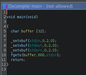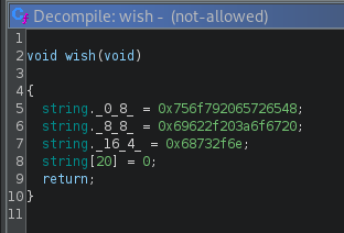 Next, let's decompile the binary. We only have 2 function of interest notably main() and wish() shown below