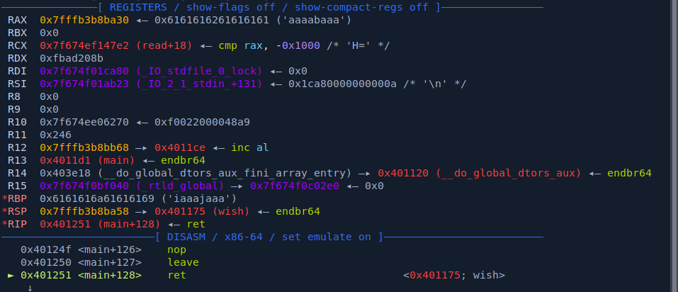 syscall;andpop rdi; ret;gadget, it does not have any other trivial gadget to control registers. And as the program returns from main, its registers are quite dirty for us to execute syscall as shown below.