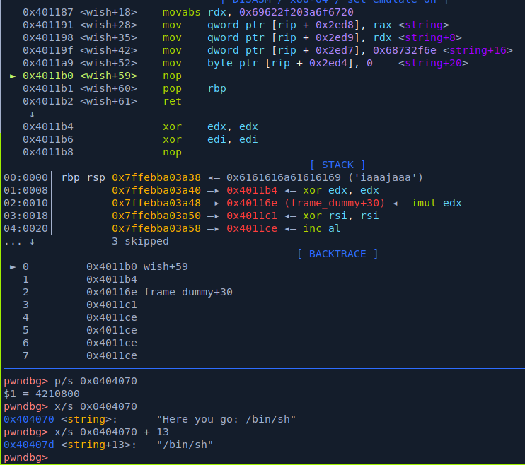 wish() will fill the global variable string with binsh that will enables us to spawn shell. This heavily emphasizes that the intended solution is to execute execve().