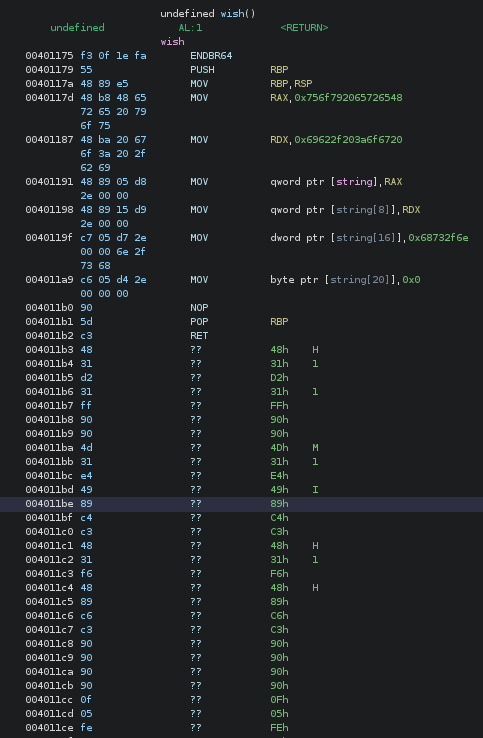 And I discovered an unusual (?) opcodes or instruction that doesn't get automatically get decompiled by ghidra just right after wish() shown below: