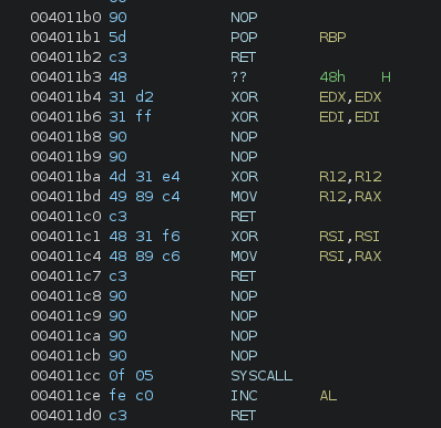 Next, I spent quite some time analyzing the gadgets found by ROPgadget to chain the gadgets trying to control RAX, RSI and RDX.