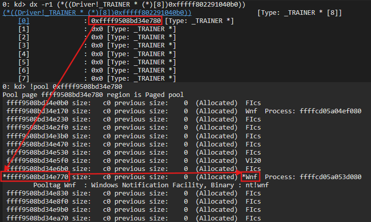 myNtQueryWnfStateData fNtQueryWnfStateData = (myNtQueryWnfStateData)GetProcAddress(GetModuleHandleA("NTDLL.dll"), "NtQueryWnfStateData");then we alloc a trainer and increase its size such that it will allocated to the 0xc0 pool, the same pool size as the _WNF_NAME_INSTANCE objects.